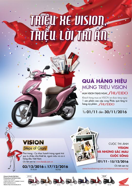 Cụ thể, khi mua xe VISION tại các Cửa Hàng Bán Xe và Dịch Vụ do Honda Ủy Nhiệm ( “HEAD”) trên toàn quốc từ ngày 1 đến ngày 30/11 khách hàng sẽ có cơ hội nhận được 1 trong số các phần quà đến từ thương hiệu mỹ phẩm nổi tiếng Nhật Bản Shiseido bao gồm: sữa rửa mặt, son môi, kem nền, bộ chăm sóc da và 1 voucher mua hàng của Shiseido thông qua chương trình khuyến mãi với tên gọi “Quà hàng hiệu mừng triệu VISION”.